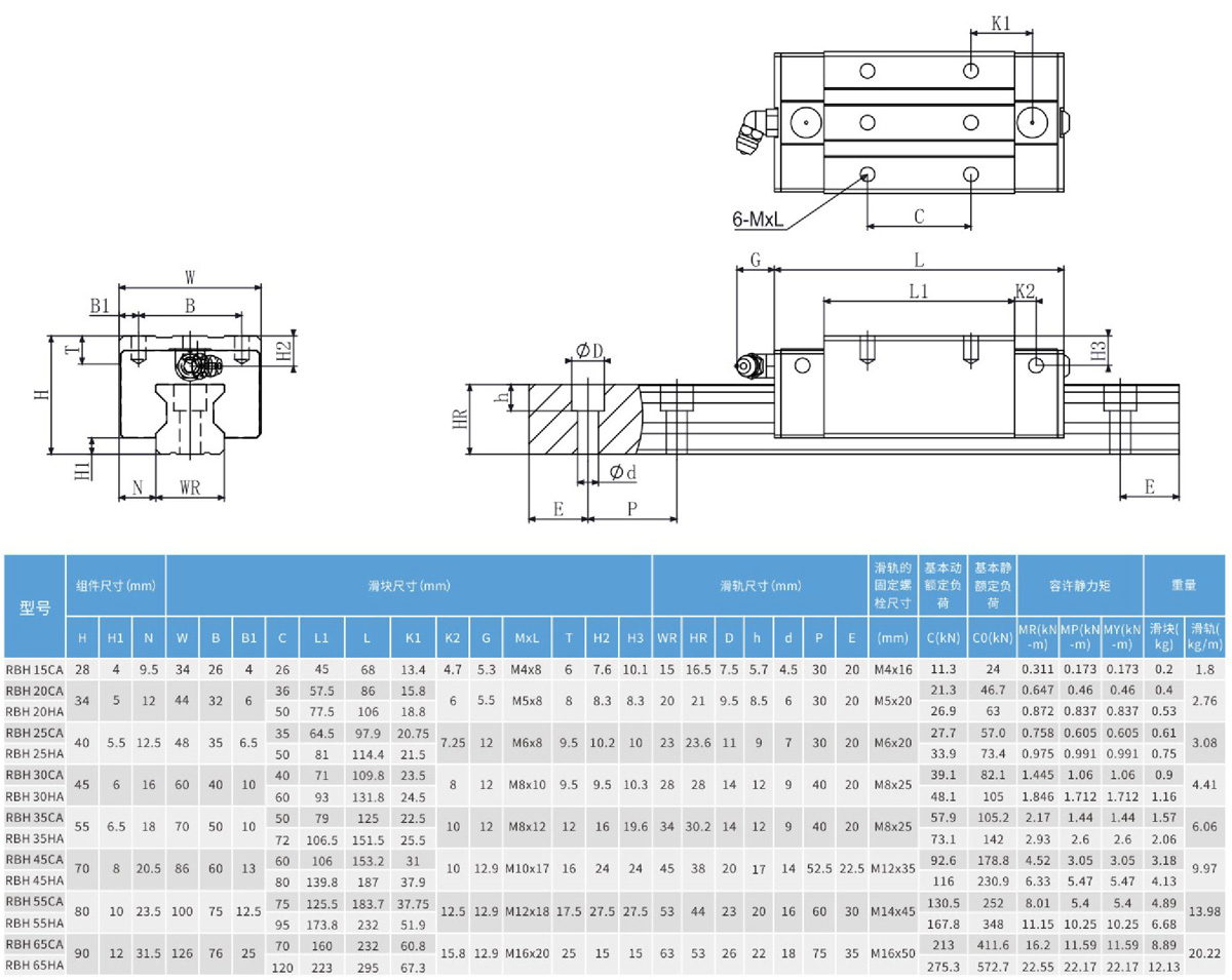 RB series linear guide with roller type rolling body instead of steel balls, for the realization of ultra-high rigidity and super heavy load capacity, through the rolling body and guide and slider linear contact way; so that the rolling body in bearing high load only form a trace of elastic deformation, but also by 45 degrees of contact angle design, so that the overall linear guide to achieve four directions, such as high rigidity, such as high load capacity characteristics of performance, through the ultra-high rigidity of Achievement, can greatly enhance the processing accuracy, to achieve high precision requirements; because of the characteristics of the super heavy load, and thus extend the service life of linear guide, very suitable for high-speed automated industrial machinery and high rigidity needs of equipment use.